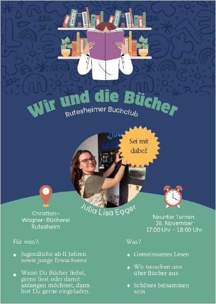 Jugendbuchclub „Wir und die Bücher“ mit Julia Lisa Egger: Am Mittwoch, 26. November lädt Julia Lisa Egger um 17 Uhr wieder zum Jugendbuchclub ein. Gemeinsam mit Jugendlichen ab 11 Jahren und jungen Erwachsenen tauscht sie sich über aktuelle Jugendbücher aus. Der Jugendbuchclub freut sich auch auf neue Gesichter!